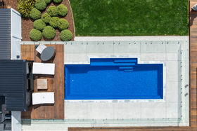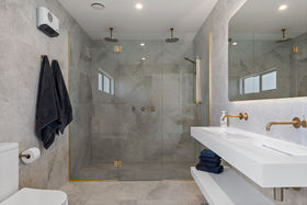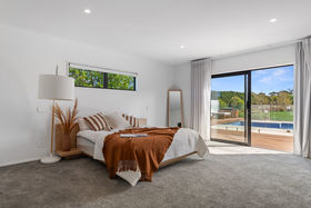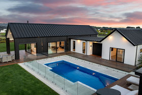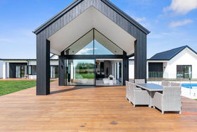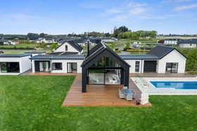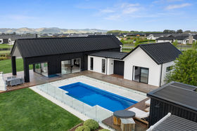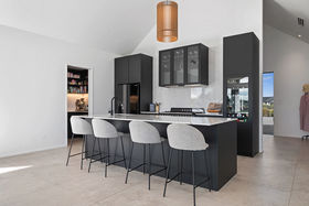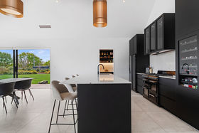 The beautifully crafted home offers modern elegance combined with functional and practical everyday living. The heart of the home is the kitchen, featuring an expansive standalone bench with a marble benchtop, designer cabinetry, a Smeg Victoria stove, and a butler's pantry. This overlooks the expansive, light, and bright living area, featuring a cathedral ceiling and easy access to the covered outdoor entertaining area and heated pool area.